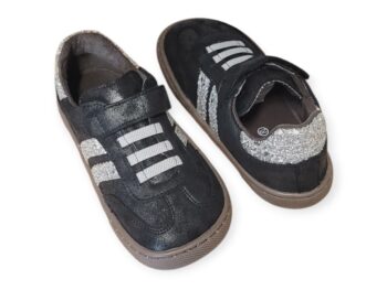 Las zapatillas barefoot Coqueflex son perfectas para niños con pies de anchura media a estrecha que buscan comodidad, estilo y libertad natural. Con suela fina de 4 mm, un velcro y cordón elástico y un diseño negro con rayas plateadas brillantes, combinan funcionalidad y diversión. Fabricadas artesanalmente en España con microfibra premium y suela de goma antideslizante.